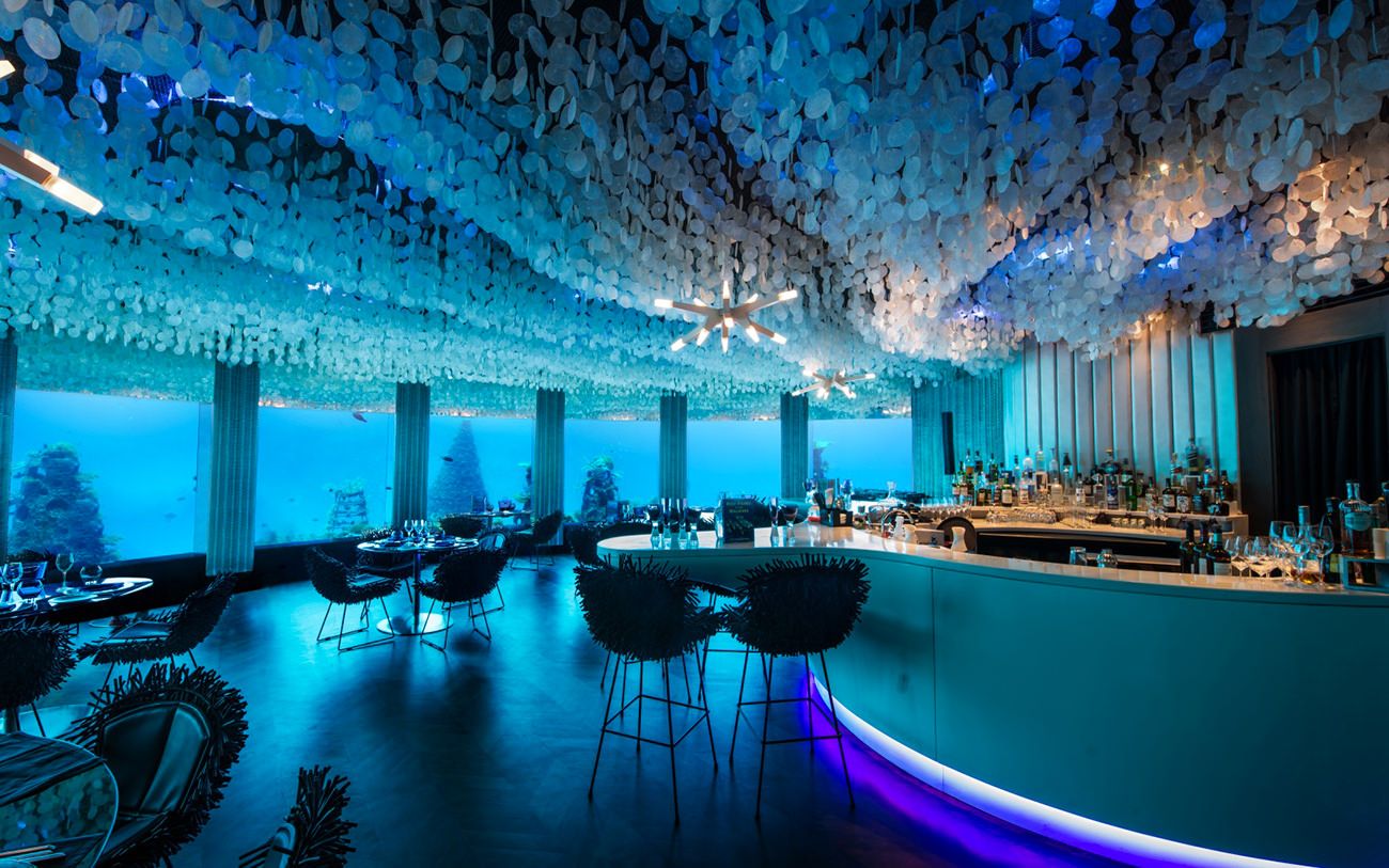 One of the earliest well-known examples is the underwater restaurant at Conrad Maldives Rangali Island, which introduced a transparent acrylic tunnel dining concept. Another recognized location is Ossiano at Atlantis The Palm in Dubai, where diners experience panoramic aquarium views.